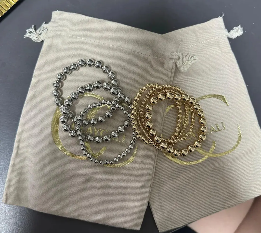 The 8543 Bead Stack features 4 stretchy bracelets 18K Premium Gold Plated beads: one (1) 8mm bracelet, one (1) 5mm bracelet, one (1) 4mm bracelet, and one (1) 3mm bracelet. All bracelets are stretchy for comfortable wear.