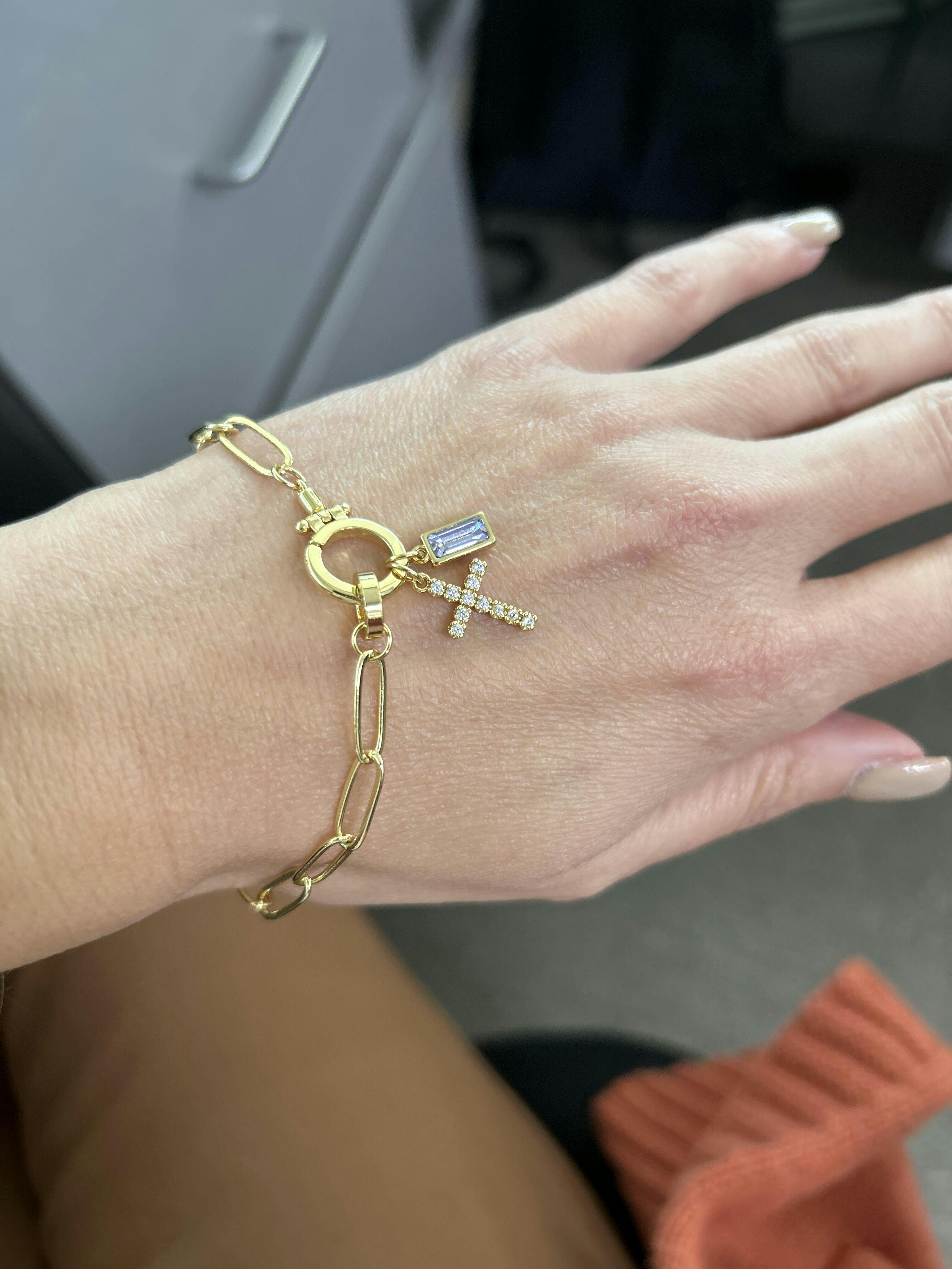 Faith made fashionable. This birthstone cross paperclip bracelet brings spiritual meaning into sleek, modern design. Crafted to honor what moves you most - wear your values with bold confidence. Effortlessly sophisticated solo, distinctively striking when stacked. A statement piece that transforms personal beliefs into contemporary luxury.